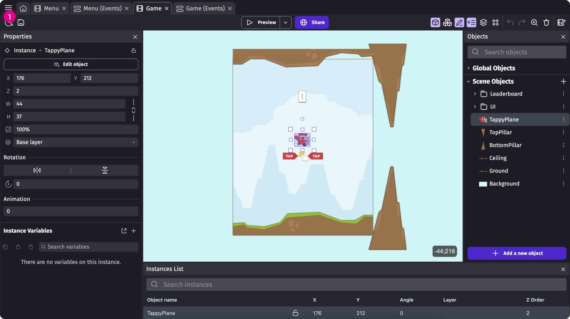 • 2. Scenes: Scenes are the different screens and levels in your game. Everything in GDevelop is created in scenes.