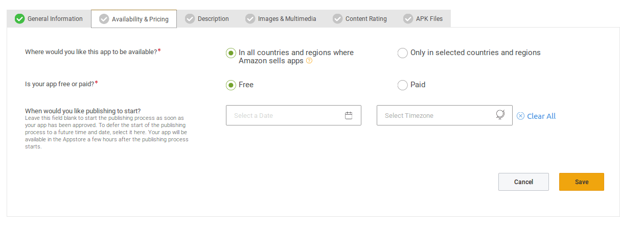 After you click on Android, a New App Submission page appears for you to enter basic information about your app.