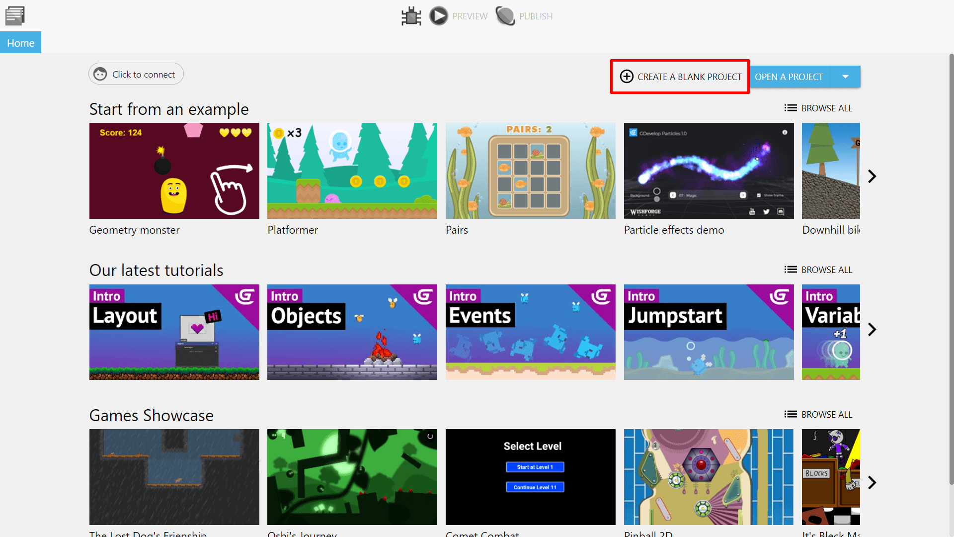 Wait till the process is complete, navigate to where all your new programs are installed, and double click on the GDevelop application to launch the editor. You will be greeted with the welcome screen on the start page. From here you can see game templates, tutorial videos, and other games made with the engine.