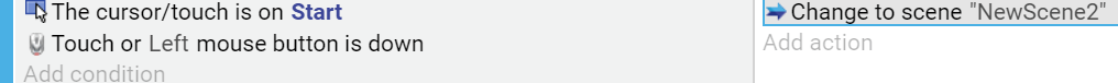 The two conditions combined checks for the left mouse button press on the Start object. Now, we need to add an action which changes the current scene to the game-play scene.
