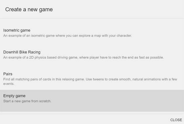 Once on the Start screen, click on the "Create a New Project" button. On doing so, a "Create a New Game" dialog box appears. Next, scroll down and find the "Empty Game" tab. Click on it to open a new project.